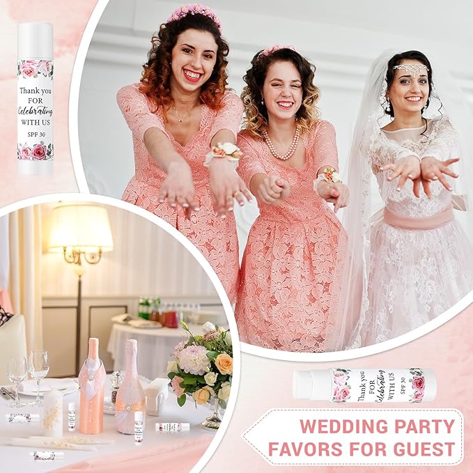 - Elegant Theme Design: our bridal shower sunscreen lipstick adopts the pattern of botanical spring and summer leaves and wedding flowers, and is accompanied by the text 'Thank You For Celebrating With Us'; It fits the theme of weddings and gift giving, enhances the party atmosphere, and expresses gratitude to the guests more accurately