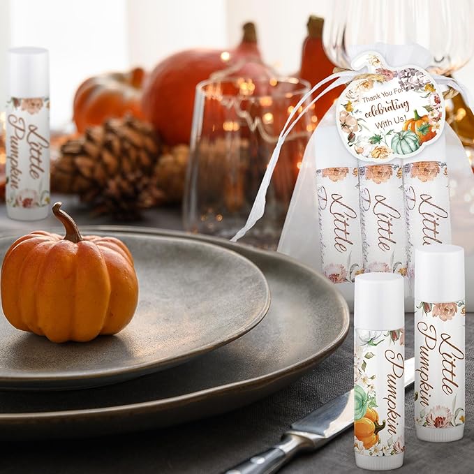 Demissle 50 Pcs Baby Shower Lip Balm Gift Set with 100 Pcs Organza Bags Baby Shower Party Favor for Guest Thank You Tag Rope Baby Shower Party Decoration Gender Reveal Souvenirs (Pumpkin and Flowers)
