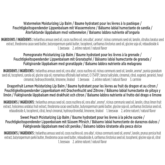 - BELOVED LIP MOISTURIZER FLAVORS: Each natural lip balm pack contains four lip balms in fruity flavors for everyday lip wear, including Watermelon, Pomegranate, Dragonfruit Lemon and Sweet Peach