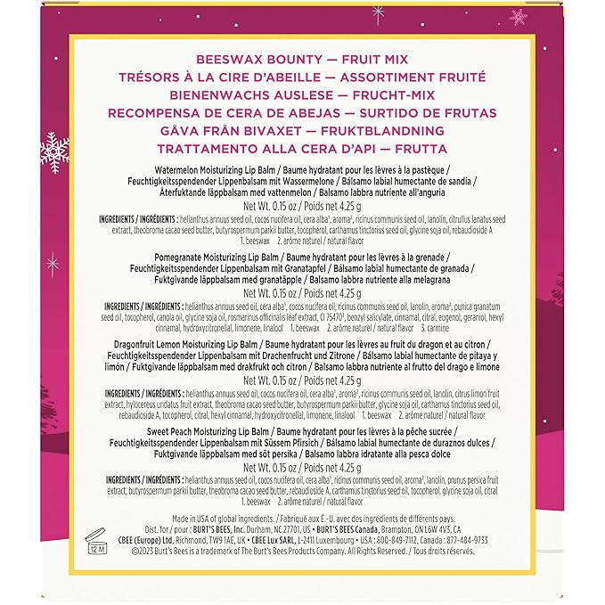 - PACKAGE CONTENTS: Each Burt’s Bees Lip Balm Gift Set contains four lip balm tubes, with one 0.15 oz. tube each of Burt's Bees Watermelon, Pomegranate, Dragonfruit Lemon and Sweet Peach Lip Balm