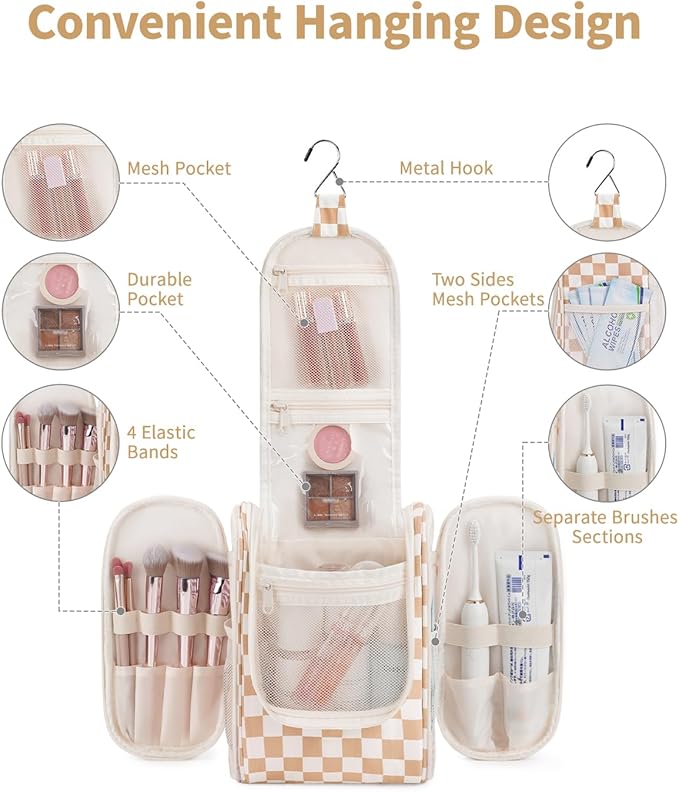 - DETAILS ORIENTED - Buit-in large metal hook allows hanging the toiletry case from towel rack, coat hook or whereever is available, making your toiletries and cosmetics displayed well for easy access, saving bathroom counter space as well. Water-resistent and durable fabric protects your gear from spills. Soft fabric and reliable zippers. Wide opening and rectangle shape makes it easy to stand on its own
