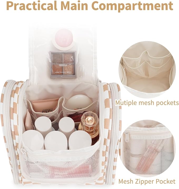 Narwey Small Checkered Hanging Travel Toiletry Bag for Women, Travel Bag for Toiletries, Makeup Bag Organizer Cosmetic Bags Make Up Bags for Women (Light Checkerboard)