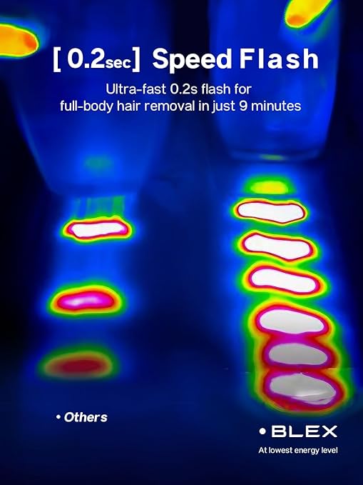 - 【Speed Flash 0.2s】Our rapid 0.2s flash technology enables a full-body treatment in a mere 9 minutes, setting a new benchmark for speed in the IPL category. It’s the ideal solution for the modern, fast-paced individual seeking quick, Blex hair removal device is reliable results.