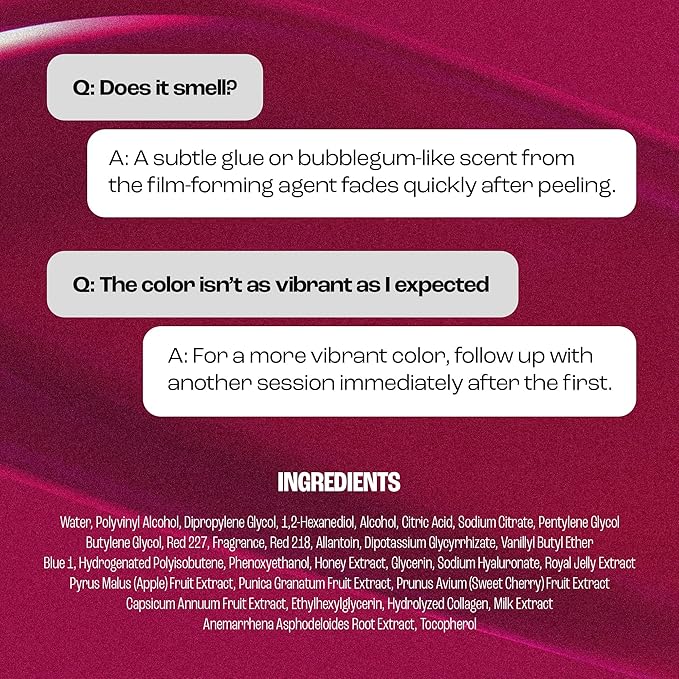 - DEEPLY NOURISHING FORMULA. Enriched with powerful Royal Jelly, Honey, Apple, Cherry, Pomegranate, Milk Protein, and Marine Collagen, this peel off lip tattoo deeply hydrates and nourishes. Special Peptides and Collagen smooth fine lines, enhance moisture and elasticity for younger-looking lips.