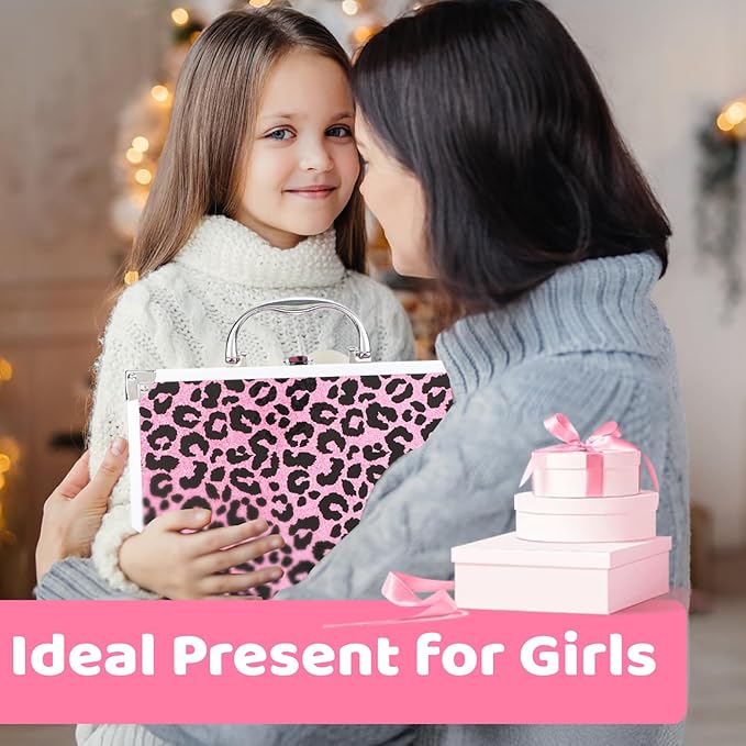 - All-In-One Teen Makeup Kit: Includes 7* eyeshadow palette (28 colors), 5* lip balm palette (20 colors), 2* blush, 4* eyeshadow cream, pink glitter gel, silver glitter gel, 8* brushes, eyeliner, lipstick, mirror, leopard cosmetic bag, and a tag, all neatly packed in a stylish makeup case