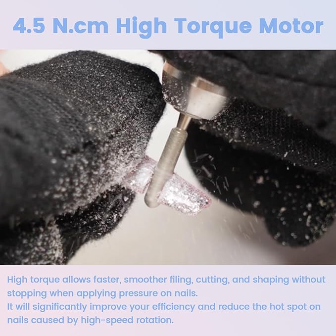 - Exclusive High-Torque Motor: The industry-leading 0.46 kgf.cm (4.5 n.cm) high torque motor enables the Delanie e-file nail drill to smoothly file off any nail products and shape any artificial nails without stopping on nails. 0.34 kgf.cm measured on the nail drill bit