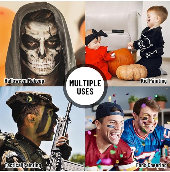 - WATERPROOF & LONG-LASTING WEAR: MEICOLY black white green face paint stick is infused with long wearing formula that makes it last all day, holding up well even during activities.The waterproof formula ensures it stay in place well even meet with water.Say goodbye to constant touch-ups as it doesn't rub off easily and stays vibrant for hours.Its non-toxic nature makes it safe for all skin types,allowing for safe face painting with comfort