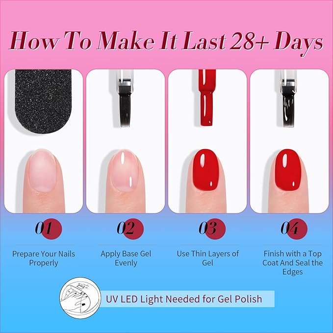 - Easy Application and Long Lasting - This gel polish set is long lasting for 21+ days with perfect shine under proper application - With base gel top coat under the full application process.High durability and intense pigmentation makes it stay last longer and brings you brilliant shine finish.