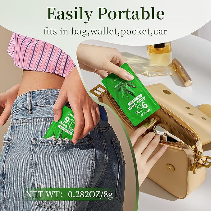 - 【99% Pure Aloe Vera Gel】This set of aloe vera gel has 30 packs,each pack is 0.282oz,each pack of aloe vera gel is individually packaged,they are very suitable for carrying around,when you use these aloe vera gel,you will feel very soothing and cool,it absorbs quickly without any sticky residue,leaving your skin smooth and hydrated