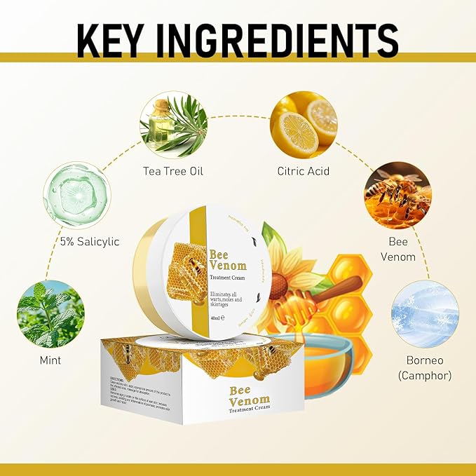 - Natural: Our Bee Venom Treatment Cream is purely natural, chemical-free, and leaves no harmful residue,The cream is gentle and suitable for all skin types, including sensitive skin, providing comprehensive care without irritating the skin