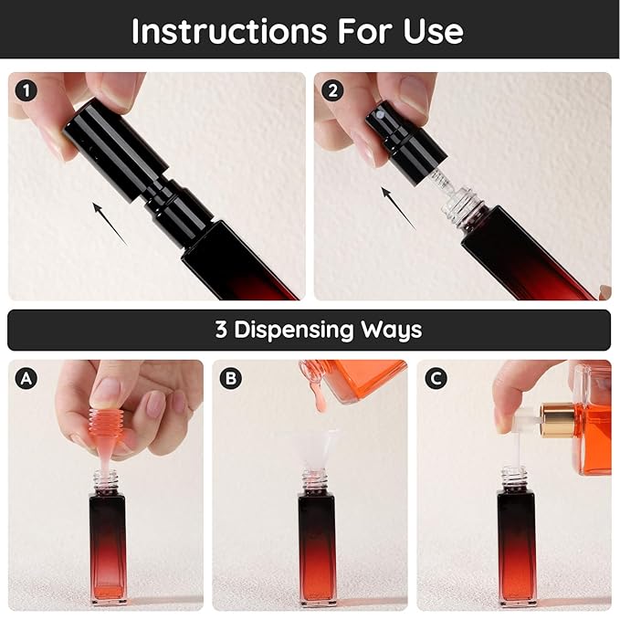 - Easy to Refill & Use: Comes with 1*FUNNEL+1*DROPPER+1*PUMP, make it easy to refill the perfume bottles with your preferred fragrance. Press pump head design, allowing you to keep your mini perfume atomizer ready for use at all times