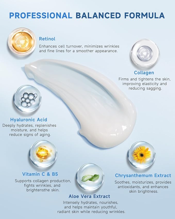 - For All Skin Types and Ages- Whether you're in your 20s, 40s, or beyond, collagen face cream deeply hydrates, firms, and revitalizes your skin, helping you achieve a healthy, youthful glow at any age. Retinol advanced face cream to the face, neck and décolletage area. Gently massage in an upward motion until fully absorbed. For best results, use morning and evening as part of your daily skincare routine