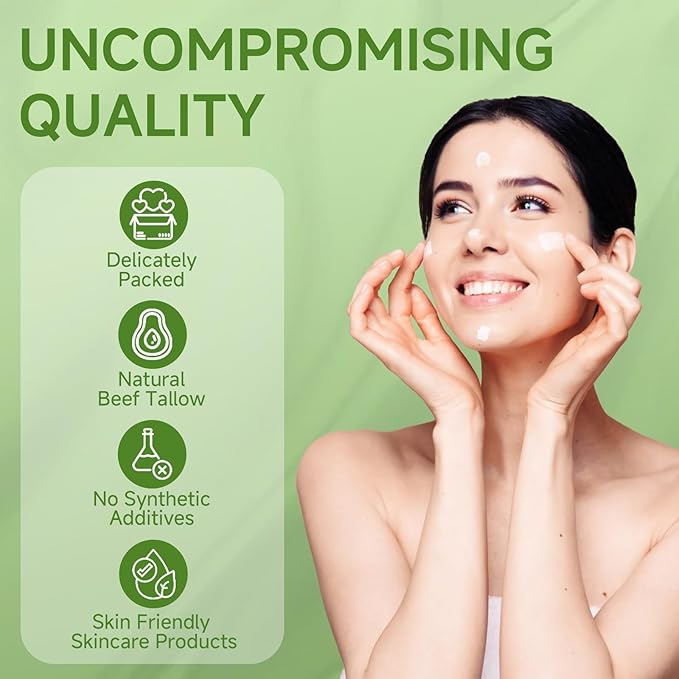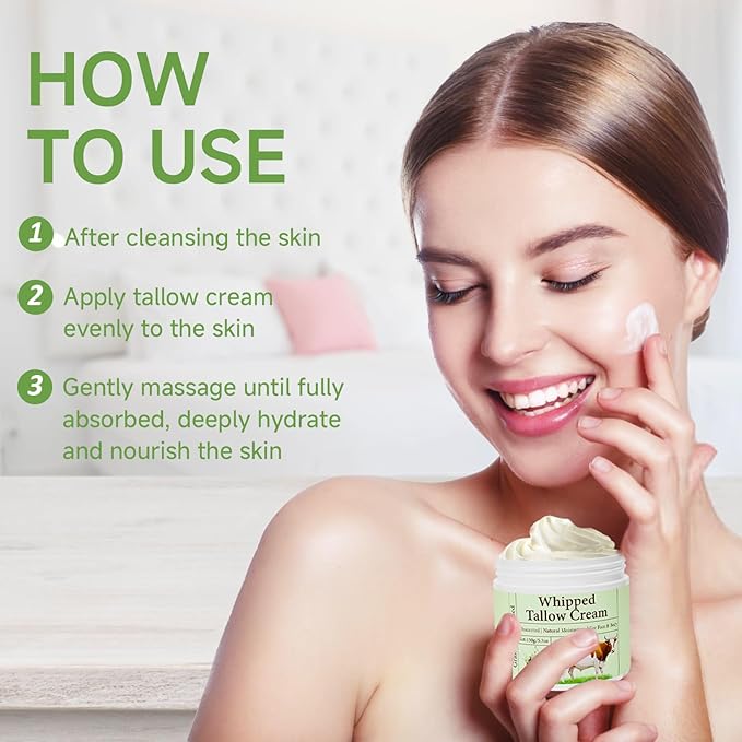- 【Gentle & Non-Irritating】Our beef tallow for skin cream is based in tallow, a natural ingredient that closely mimics the structure of your skin's natural barrier. Unlike synthetic moisturizers, beef tallow for skin provides deep nourishment after application. Our luxurious tallow-based moisturizer goes beyond surface hydration—beef tallow for skin actively reinforces your skin's protective barrier, reducing irritating while locking in moisture for 24-hour whipped.