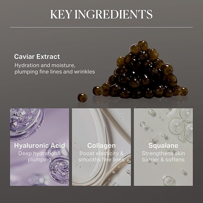- [ PREMIUM INGREDIENTS FOR VISIBLE RESULTS ]: Infused with caviar extract, hyaluronic acid, collagen, squalane, and niacinamide, this luxurious serum mist deeply hydrates, firms, and smooths fine lines—revealing radiant, youthful-looking skin.