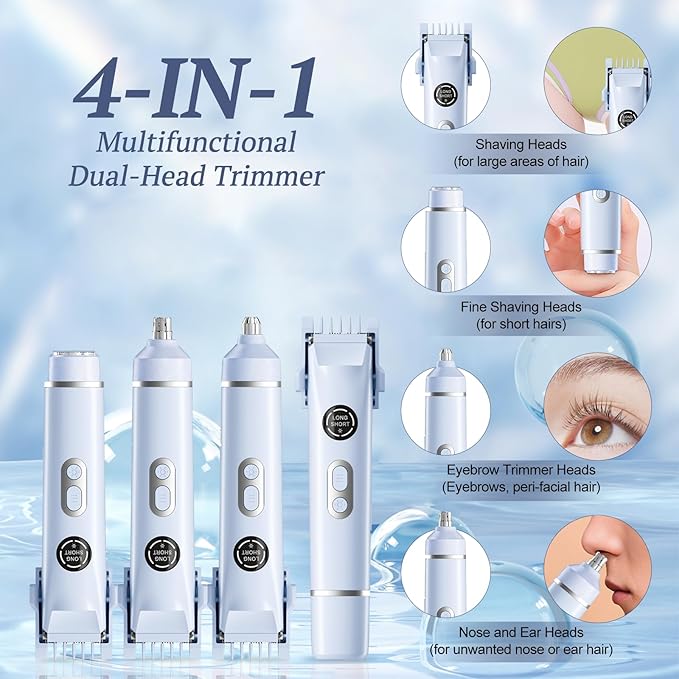 - 💧【IPX7 Waterproof, Wet & Dry】The 4 heads of this hair trimmer women are IPX 7 waterproof, which provides a very comfortable and safe shaving experience, whether used with shaving foam or dry. The blades are completely waterproof and easy to clean, can be rinsed directly with tap water or soaked in the sink to save time on cleanup