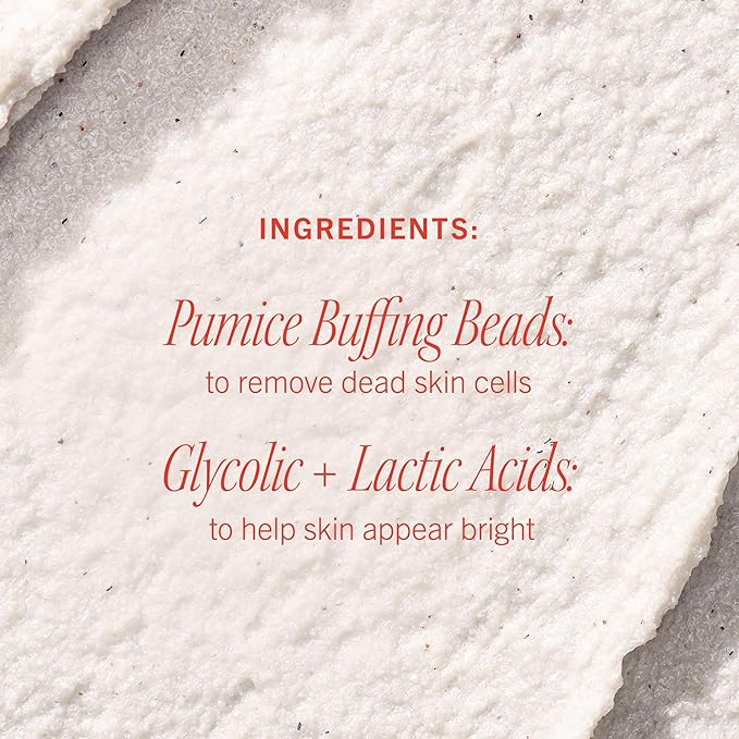 - Buff Away Dead Skin: Glycolic and Lactic Acids at a combined level of 10% help loosen skin’s top layer and decongest pores, while Pumice Buffing Beads (NOT microplastic!) whisk it all away
