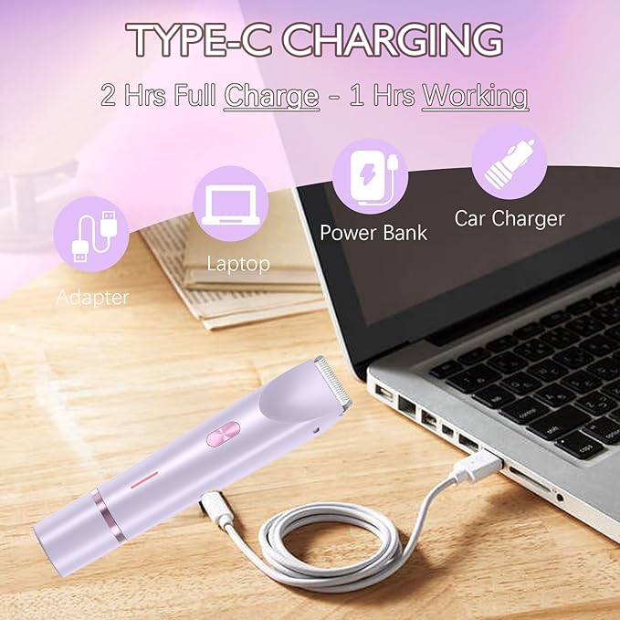 - USB RECHARGEABLE & TRAVEL FRIENDLY: Our 2-in-1 body hair trimmer and face hair remover for women can be charged with car chargers, computers, power bank, etc. Just 2 hours of charging unlocks up to 60 minutes of cordless convenience. This face shaver for women with a stylish look, super quiet when shaving. Its compact, sleek design slips effortlessly into your makeup bag, so you can enjoy a smooth shave anytime, anywhere.