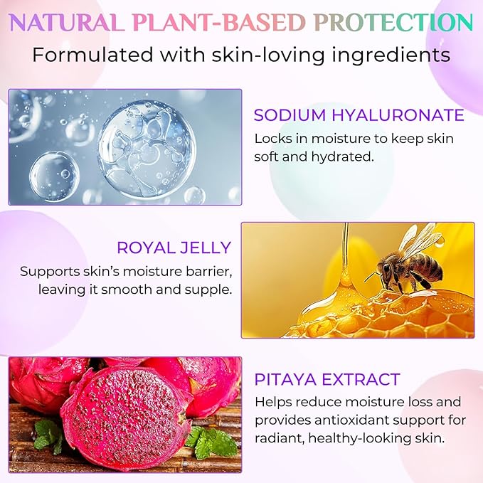 - 【Skin Protection and Repair】Adding natural ingredients such as sodium hyaluronate, hydrolyzed pearls, and cactus fruit extract, which protects against the sun while nourishing the skin to avoid dryness or irritation.