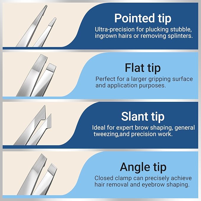 - Pecision Tweezer for Eyebroes: Eyebrow tweezers are made of surgical grade stainless steel, durable, sharp & easy to clean. The tips of these tweezers for women facial hair are sharp and perfectly aligned, so that tweezer can precisely clamp the roots of the ingrown hair to reducing the painess while plucking. The tweezers can be tightly closed without too much pressure, easy to griping and removing short, sparse, thin eyebrows or hair