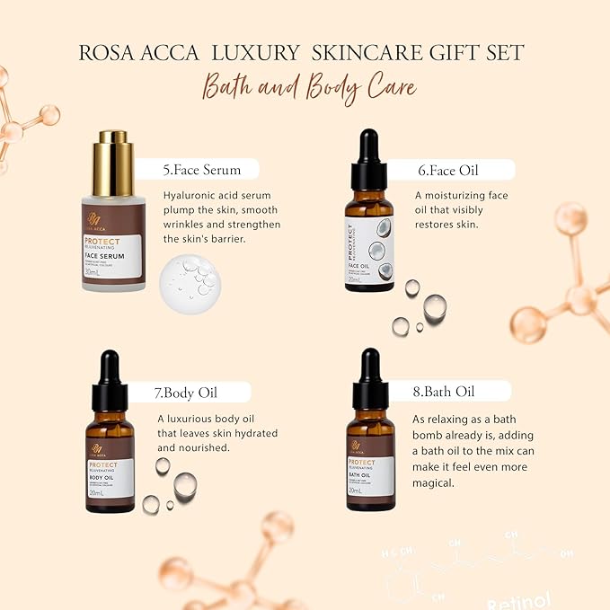 - Skin-Loving Ingredients: All Rosa Acca products are made from skin-loving ingredients you want. Rich in essential oils, ceramide, shea butter, argan oil, coconut oil and hyaluronic acid, it can effectively cleanse and moisturize your skin, Whether you have dry, oily or normal skin, our skincare & spa set is suitable for all skin types